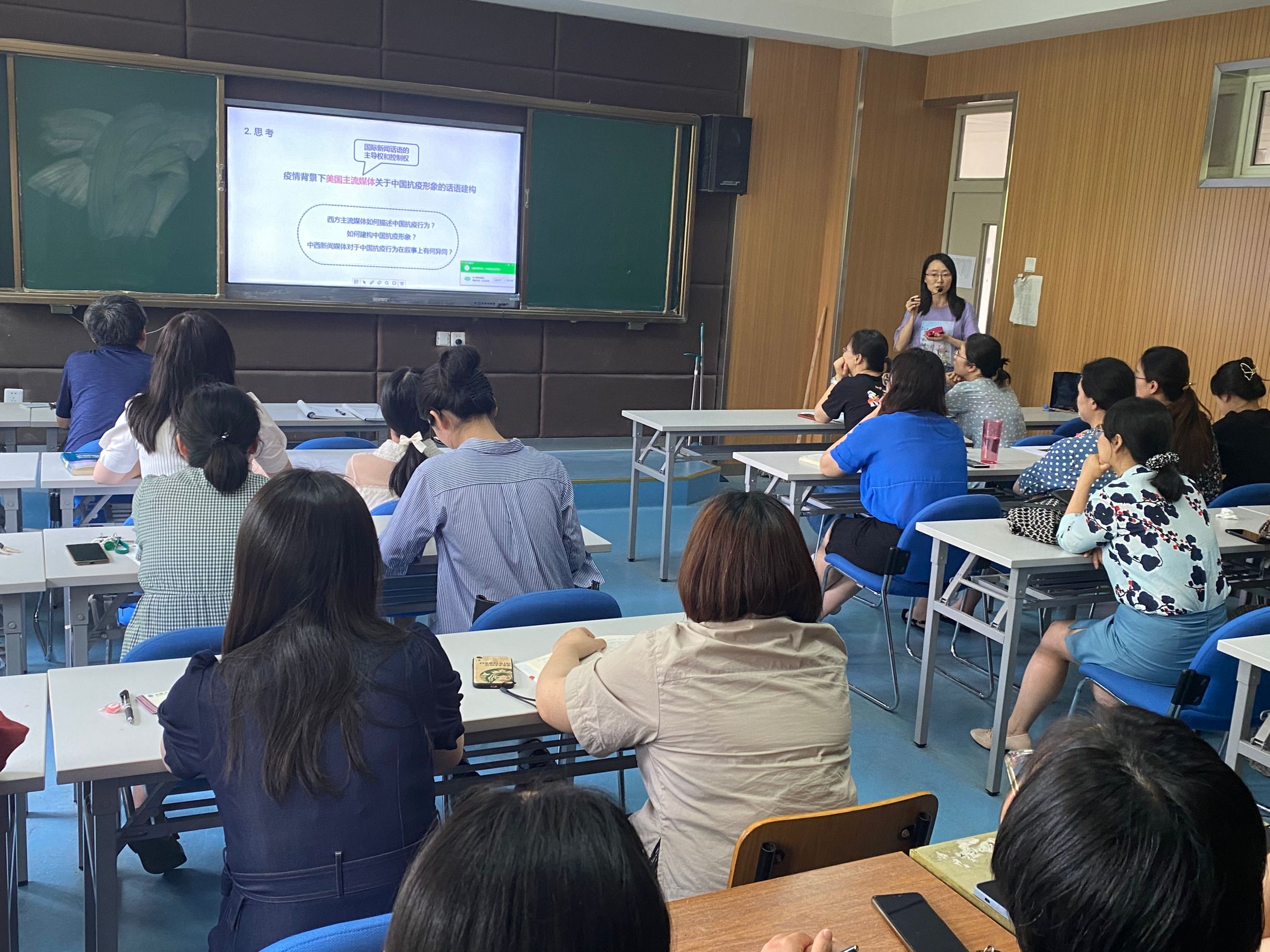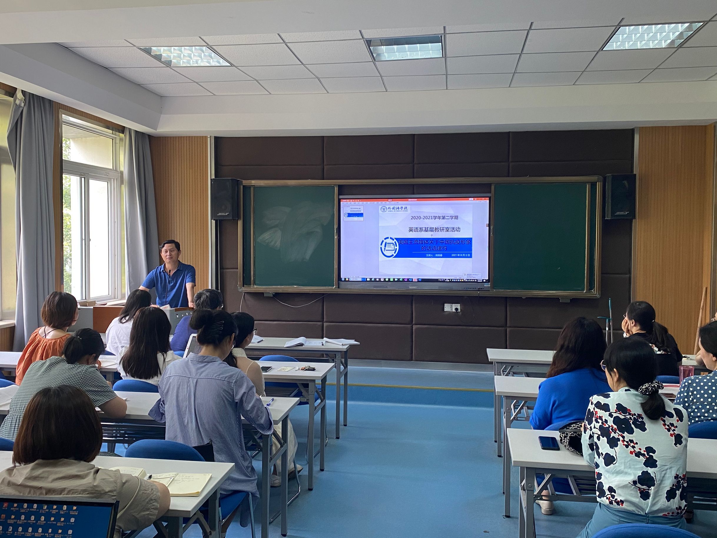 本网讯(通讯员:周晓春)为进一步发挥“双基建设”的示范作用,更好地提升师资队伍的教科研能力,6月2日,外国语学院英语系在教10-206教室开展第四次科研主题交流活动。本次活动的主讲人为周晓春副教授,主题为“美国主流媒体关于中国抗疫形象的话语建构”。外国语学院执行院长杨磊、教学副院长王志宏、英语系主任郭丽以及英语系全体教师参加此次交流活动,交流会由郭丽主持。