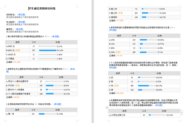 同时,学院以线上资助诚信知识问卷的形式开展资助知识普及宣传,近千名办理助学贷款的在校生积极参与,知识问卷不仅设置如助学贷款的类型、申请助学贷款需要的材料、还款方式等知识普及型问题,还专项设置如不按时归还助学贷款有何不良影响、对助学贷款的违约行为有哪些处理措施等诚信教育类问题,起到普及资助知识、加强诚信教育的作用。