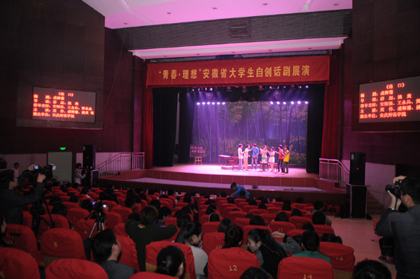 自2012年3月份以来,以“青春、理想”为主题的安徽省大学生自创话剧展演活动在我省各类高校陆续开展,为更好的指导学生参赛,校团委特聘请了专业教师全程指导学生参赛,经过努力,最终成功上演了“灵魂的天使”主题话剧并获得了较好成绩。