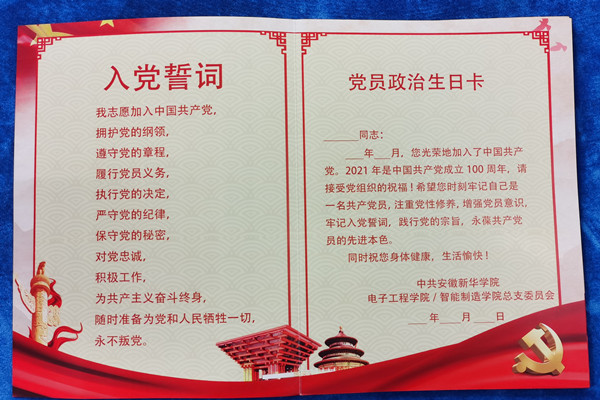 在建党100周年之际,电子工程学院/智能制造学院党总支对毕业生党员提出新要求,希望毕业生党员在今后的学习和工作中,时刻在思想上和行动上与党中央保持高度一致,强化党员党性意识,进一步增强党组织的向心力和凝聚力。同时向毕业生党员赠送政治生日卡。
