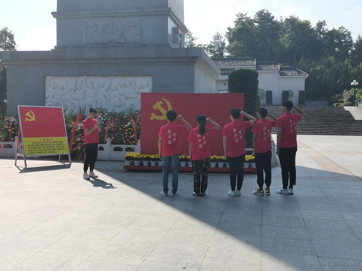 将士的英魂在此安息,团队一行向前一步一个台阶,最前面台阶共有59级,寓意着在金寨县的土地上诞生了59位开国将军,在全国将军县中位居第二,成为全国著名的将军县。而后上面两边的台阶是49级,表明金寨县的解放时间是在1949年。在往上有个25级台阶和28级台阶,分别寓意在金寨县境内组建的红25军和另一支红军队伍——红28军。每级台阶,都有着独特的含义,步入到28级台阶时,映入眼帘的便是革命烈士纪念塔,塔上有着刘伯承元帅亲笔题写的“燎原星火”四个大字,不由心生敬畏。高耸的纪念塔下,放满了承载着人们缅怀先烈的鲜花,团队中的五名党员同志于塔前的党旗下进行宣誓,以重温入党誓词。党的光辉历程在祖国大地上处处显现着红光,转步到上将洪学智将军纪念碑前,成员们肃然起敬,纪念碑的两侧分别矗立着两排石柱,都是洪学智将军曾经的辉煌历史。为了新中国和人民,有着无数革命烈士牺牲,望着墓园内座座坟冢,再放眼现在万里山川的平和,离不开金寨人民,是这些烈士以大无畏的牺牲精神,为中国革命事业建立了彪炳史册的功勋,后辈们也定将沿着革命前辈的足迹继续前行,化作点点星火,把红色江山世世代代传下去。