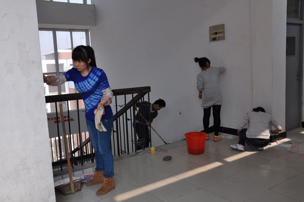 为了不影响正常教学秩序,这次清扫被安排在周末。同学们被分为若干个小组,每个小组负责一层教学楼。楼梯拐角的尘土堆积在那里,拖把扫帚都无法清理,同学们就找来小刀、刷子,一点一点的刮。墙面上的污渍很是头疼,大家就用砂纸一遍一遍地擦。厕所里的小广告最多,同学们先用水浸泡,再用钢丝球反复擦洗。装饰画、宣传栏、应急灯挂得高,有的还通电危险,大家就用竹竿绑着扫帚、抹布,一个一个地慢慢清理上面的灰尘。朝外的玻璃门上灰尘落了厚厚一层,同学们先用抹布清理干净,再用报纸擦亮。周六气温骤升,厕所里散发出难闻的气味,擦墙的同学身上落上了一层白灰,有的同学衣服上沾满了污渍,有的同学穿着夏装仍然汗流浃背,但是大家没有因此而降低工作标准。在集中清扫结束后,同学们还组织了自查自纠,力求达到最好效果。经过一天的工作,教学楼面貌焕然一新,小广告消失了,卫生死角没有了,窗户干净明亮,墙壁洁白如新,为广大师生提供了一个崭新的学习生活环境。