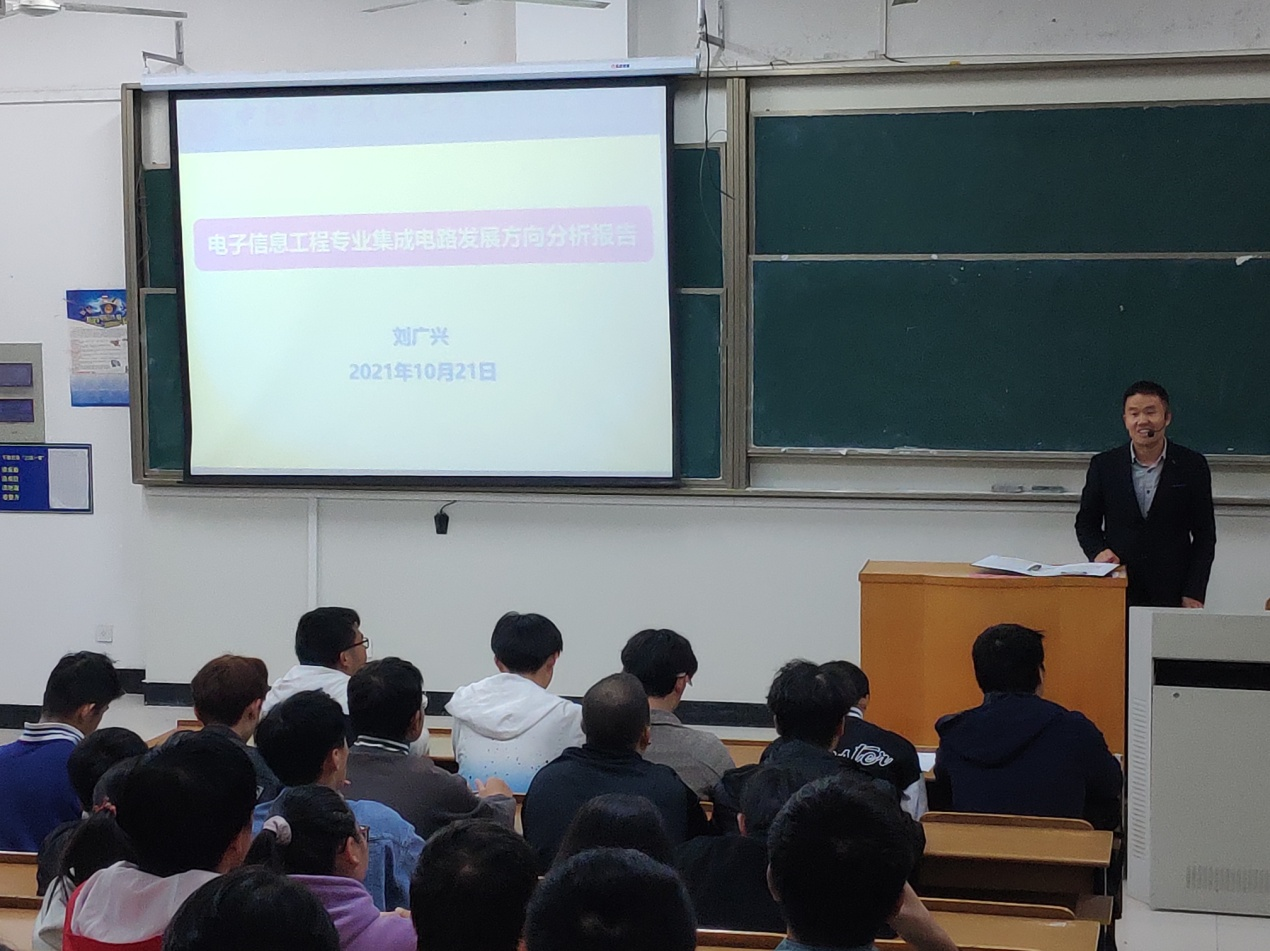 刘广兴以电子工程信息专业发展情况为切入点,对电子信息工程专业相关的产业和行业进行了解读,对合肥本地的电子工程信息专业就业形势进行了分析。并从国际形势、国家战略布局、合肥城市定位等方面对合肥集成电路产业发展进行了详细介绍。刘广兴提到,在建的集成电路产业园是合肥政府主导的重点建设项目,产业园的建成将带来大量国内外集成电路的优秀先进企业,为电子信息工程专业的学子提供广阔的发展空间和大量的就业岗位,电子信息工程专业前景广阔,前途光明,大有可为,大有能为,大有作为。针对四年的大学时光,刘广兴建议同学们提前抉择考研或就业,尽早做好职业生涯规划,并分别对两种发展路径进行了解读,为同学们提供了思路和建议。