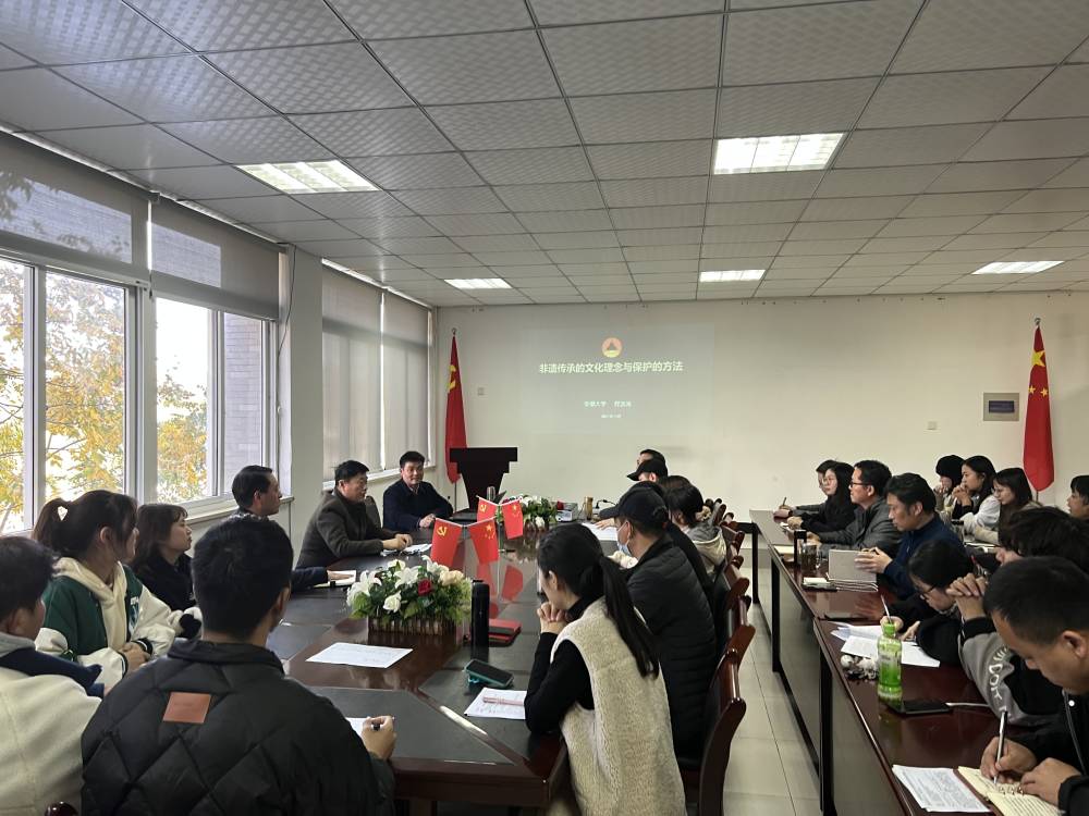 本网讯(通讯员:杨蕊)为推进学科建设,进一步提高教师科研能力,尤其是加强对地域文化的研究,争取获得高层次项目成果,11月24日下午,艺术学院特邀安徽大学艺术学院教授、博导、安徽省民间文艺家协会副主席、省美术家协会理论专委会副主任程波涛,作“非遗传承的文化理念与保护方法”专题讲座。艺术学院全体教师和部分大创项目同学参加讲座,艺术学院院长江河主持讲座。