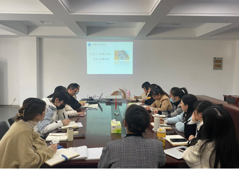 11月29日,文化与传媒学院召开安全工作研讨会,副院长(主持)洪玉、行政副院长罗振林及学院全体学工参加会议。会议由罗振林主持。在会中,各辅导员分别汇报了近期班级管理中的安全具体工作。此外,罗振林还提出了强化意识、实事求是、增强责任意识三点具体要求。最后,洪玉表示,要结合学院工作实际,坚持把安全工作作为底线工作来抓。各位辅导员老师要牢记工作职责,以对全体学生负责为出发点,以高度的责任感、一丝不苟的工作态度做好这项工作。