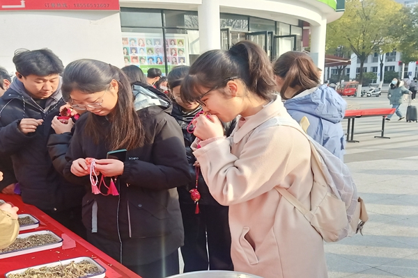 活动开始,同学们在志愿者的安排下有序领取香囊。此次制作香囊共有2000份,颜色、种类多样,学生们可以依照喜好挑选自己喜欢的香囊。活动现场还设置有现场制作台,同学们按照志愿者的教导现场制作香囊,增加同学的动手创作能力。同时,老师和志愿者在旁对此次制作的香囊进行简要介绍,如此次制作香囊的材料有白芷、苍术、公丁香、广木香、薄荷、藿香、艾叶,具有祛瘟除秽、开窍解毒、防病治病的作用。活动在师生们的欢声笑语中进行着,寒冬暖阳烘托着现场欢悦的气氛。寒冬日子里,药学院为华园学子送来了美好的祝福。小小香囊饱含学校对每一位华园学子的贴心关爱,更是对华园学子们提高免疫力、好好学习、共同进步的美好祝愿。