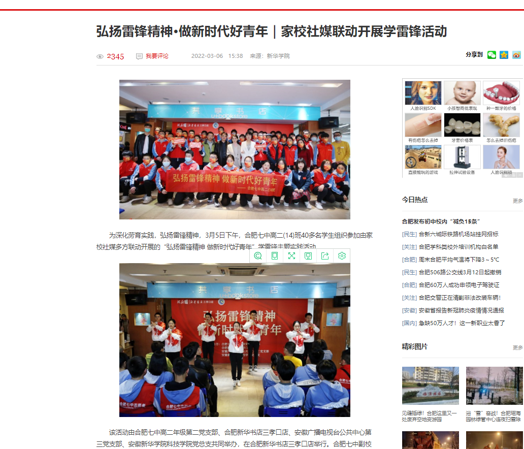 本网讯(撰稿:杜龙威、摄像:王振)为深化劳育实践,弘扬雷锋精神,3月5日下午,由3044am永利集团3044noc科技学院党总支、合肥七中高二年级第二党支部、合肥新华书店三孝口店、安徽广播电视台公共中心第三党支部共同主办的“弘扬雷锋精神 做新时代好青年”学雷锋主题实践活动,在合肥新华书店三孝口店举行。