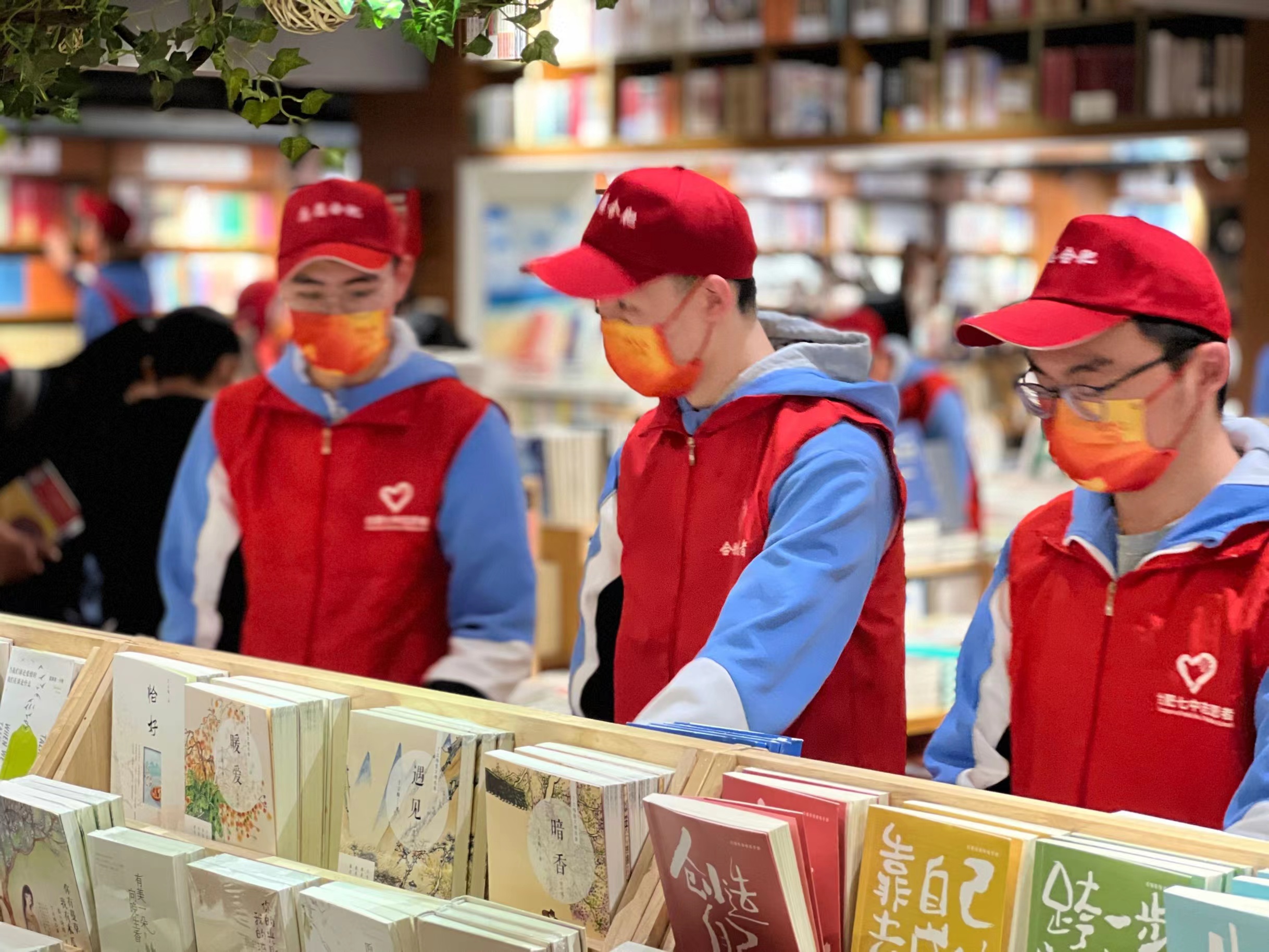 活动中,身穿志愿者马甲的志愿者们,分为两组,一组在书店附近积极向往来居民宣传雷锋精神,送出近200份《弘扬雷锋精神 新时代好青年》倡议书;另一组来到书店的4层至6层,协助各楼层的书店工作人员进行图书整理以及楼层收书,进行文明督导、制止不文明阅读现象,提醒读者佩戴口罩、协助开展疫情防控等。整整一个下午,志愿者们激情满满,各岗位分工协作,现场秩序井然,共同打造了更加整洁、舒适、宁静的“阅读空间”。