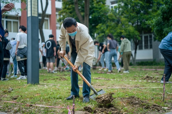 劳动教育活动开始,首先由朱平教授为同学们示范如何松土,同学们认真学习,随后便开始了自行劳作。大家进行分工,彼此合作,男生负责拿着铁锹进行松土,女生负责捡起土壤中的杂物。大家干劲十足,将种子有序地播撒在土壤中,为它们灌溉生命之水。同学们对于本次的劳动教育活动热情高涨,活动过程中无一不露出幸福的笑容。