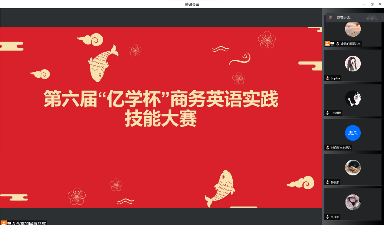 本网讯(通讯员:金露,王羽倩)由外国语学院/国际教育学院主办的第六届“亿学杯”全国商务英语实践技能大赛线上校内选拔赛于4月20日圆满落幕。该项赛事旨在综合培养学生的商务英语专业知识和实践技能,促进高校商务英语课程理论和实践相结合,也为 “高教社杯”全国商务英语实践大赛和“亿学杯”全国商务英语实践技能大赛输送优秀选手。比赛吸引了全校40余名学生报名参加。