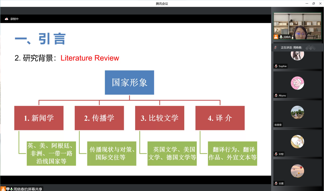 本次研讨活动的主题是“国内主流媒体双碳话语中的中国国家形象建构——基于语料库的积极话语分析”。周晓春首先介绍了“双碳”战略目标提出这一选题背景,梳理了相关研究的现状和动态,指出“双碳”语境下的中国国家形象自塑研究是目前该领域的研究空白。随后,她从拟解决的问题、语料来源、思路和方法三个方面详述了研究设计和过程。最后,周晓春从积极话语分析视角,解读了如何采用语料库技术来剖析国内主流媒体在双碳话语中所建构的“负责任、有担当”的大国形象。该研究得出的结论对新形势下中国特色双碳话语体系的建设具有重要启示。