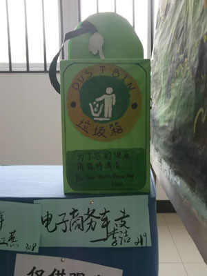 本次设计大赛以“注重节能环保,创建文明高校”为主题,通过利用生活中的废弃物品来制造环保垃圾箱。所展示的垃圾箱主要分为环保型简易垃圾箱和创意型美观垃圾箱,环保型垃圾箱中有的是由铁丝把各类塑料瓶组合成型,有的是用废弃的一次性筷子集扎成箱。创意型垃圾箱中有的是由小铁桶加上废弃木头装成的架子组成,有的是将废弃装修塑料门板组装成“鸟巢”形等,每个垃圾箱的周围都细心地张贴着有关环保的标语标识。