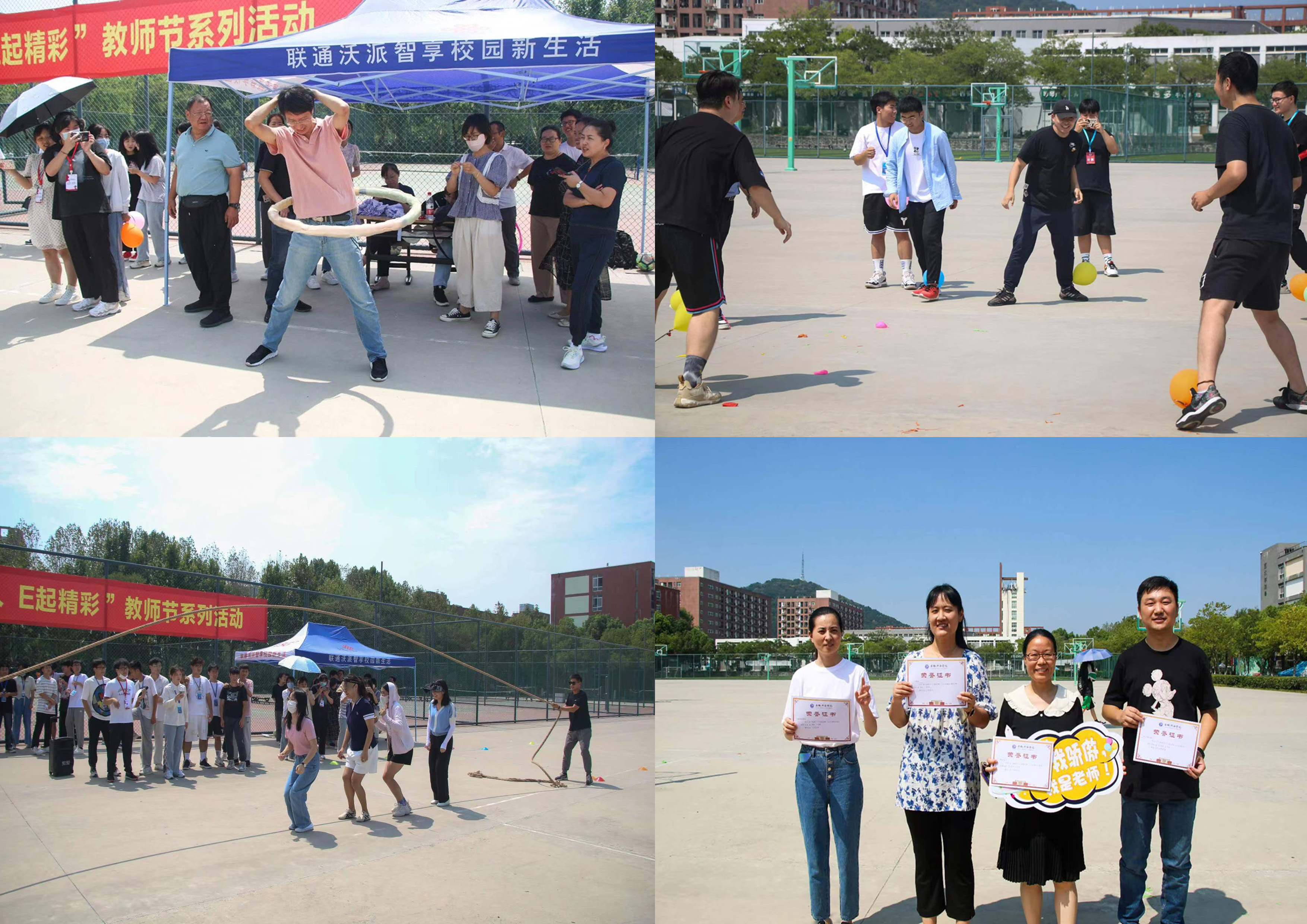 中午12时,学院在蜀山体育场为全院教职工举办了趣味运动会。活动内容包括跳大绳,快乐呼啦圈,足球绕点,筷子夹球,二人三足20米接力,激情碰撞。比赛场上,每一位教师笑容满面,精力充沛,朝气蓬勃。现场欢声笑语,加油呐喊声此起彼伏。赛后,吕翔为参赛教职工颁发获奖证书。