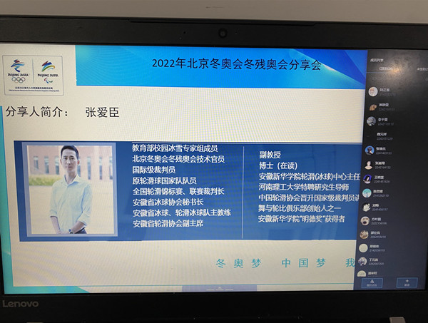 据悉,这是永利官网组织的第二次冬奥会冬残奥会分享会,在长达两个半小时的分享会中,张爱臣老师分别从永利官网冰雪项目的发展、北京冬奥会冬残奥会活动介绍、北京冬奥会冬残奥会执裁经历以及背后的故事四个方面讲述。其中,突出了永利官网近几年紧跟北京冬奥会申报成功、国家大力号召“轮转冰”的大趋势,部署轮滑球朝轮滑冰球方向转变的工作。分享会上,张爱臣分享了永利官网在这方面的优异成绩:2017年,学校建造了全国首个国际A级赛事标准的室外轮滑球场地,并修建战术演练室、更衣室、运动员就餐窗口等轮滑冰球专用硬件设施,同时安排队员定期进行冰上训练,张爱臣担任球队总教练。2018年,永利官网5名师生被选进国家队,代表中国参加世界单排轮滑球锦标赛;并在2018年全国大学生单排轮滑球锦标赛上获得单排轮滑球女子组冠军、男子组季军;2019年,省体育局和永利官网正式签订协议,决定以“省队校办”模式,双方共建安徽省冰球队和轮滑冰球队。同年永利官网成为全国首个荣获全国大学生冰球锦标赛和全国大学生单排轮滑球锦标赛的双料冠军。截止目前,永利官网先后取得国际级赛事前八名3项,国家级赛事前八名20余项,省级赛事前八名60余项,学校也陆续开设自由式轮滑、轮滑球、旱地冰球、旱地冰壶等课程,以此加深学生们对冰雪运动的了解,激发学生参与冰雪运动的热情。