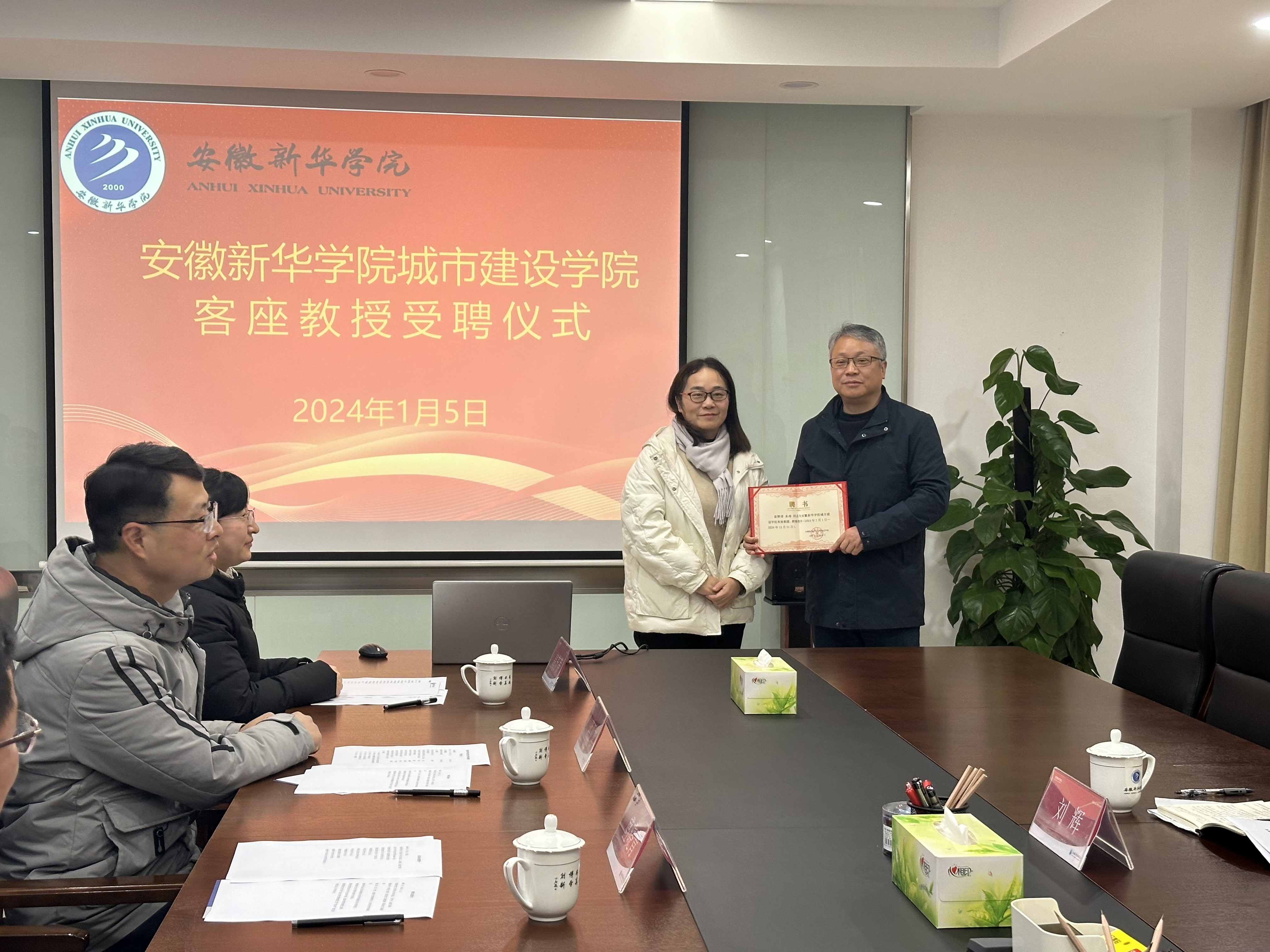 本网讯(通讯员:高苏蒂)1月5日上午,城市建设学院在科研楼508会议室举行了客座教授聘任仪式,聘任安徽省消防工程有限公司法定代表人、总经理朱涛,安徽省消防工程有限公司技术总监刘辉为城市建设学院安全工程专业客座教授。副校长戴昕、校长助理兼人事处处长盛晓青、城市建设学院执行院长赵倩青、院长助理罗月颖、安全专业学科带头人蒋亚龙教授与安全工程专业教师及部分学生参加了聘任仪式,会议由赵倩青主持。