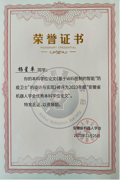永利官网学子毕业论文获评2023年安徽省机器人学会优秀本科毕业论文