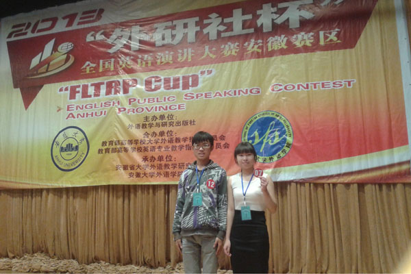 本网讯(通讯员 朱玉鑫)10月25-27日,2013年“外研社杯”全国英语演讲大赛安徽赛区的复赛和决赛于在安徽大学磬苑校区举行。永利官网选派袁丹丹和陈令号两位同学分别代表英语专业组和非英语专业组参赛。袁丹丹同学取得全省二等奖的好成绩。陈令号同学也展现了自己的最佳水平,积累了大赛经验。