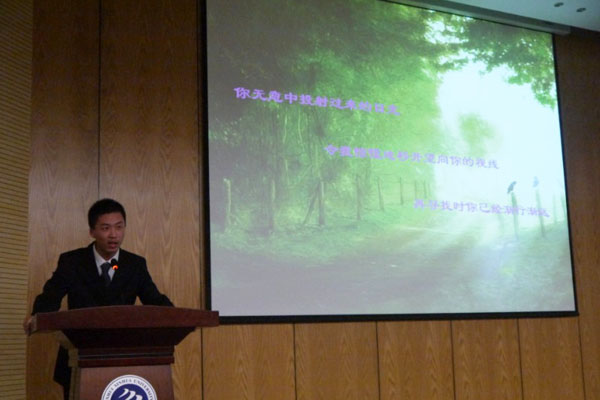 在决赛的第二个环节,每位选手都深情地朗诵并解读了自创的三行情书。简短而富有深意的诗句,配以生动优美的图片,比赛现场氤氲着浓浓的诗情画意。