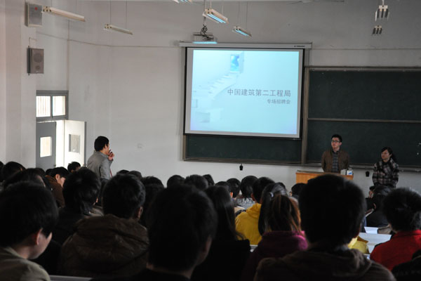 本次招聘会面向土木工程、安全工程、工程管理等多个专业录用毕业生。招聘会前,土木与环境工程学院对学生进行了就业指导,指导学生进行对口的简历制作、模拟面试技巧、引导学生作出合适的选择。招聘会现场,150人的阶教座无虚席,很多同学还站在后面听宣讲。在播放企业宣传片后,公司人事部门代表详细介绍了单位情况、岗位要求、培养机制、发展空间、福利待遇等等,并就如何选择合适的单位和岗位与大家进行了交流。同学们就自己关心的问题当场提问,几位工作人员现场回答,整个应聘过程气氛热烈。