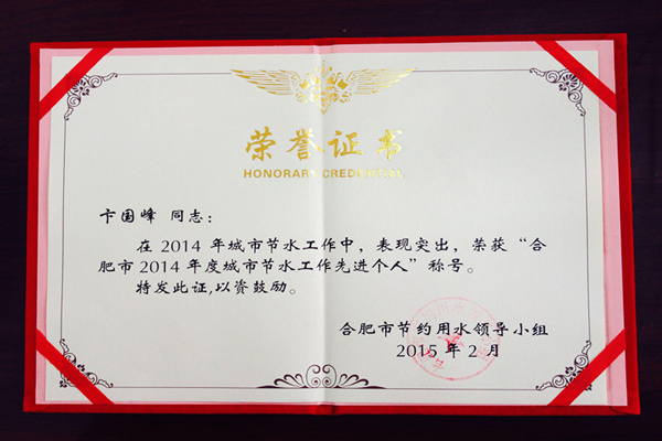 本网讯(通讯员:董梅)3月20日上午,合肥市城乡建委召开了“合肥市2015年城市节水管理会议”。永利官网卞国锋同志被合肥市节约用水领导小组授予了“合肥市2014年度城市节水工作先进个人”称号。