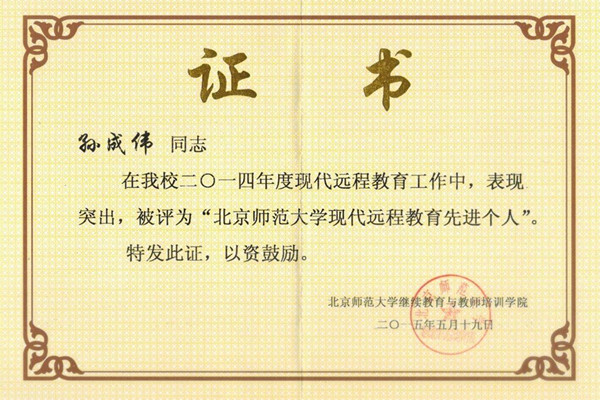 永利官网获评2014年度“北京师范大学现代远程教育优秀学习中心”称号