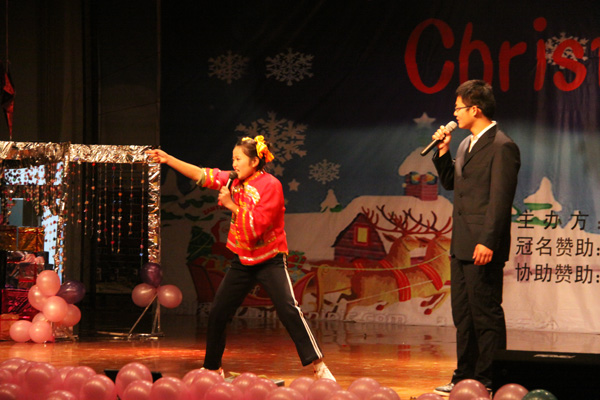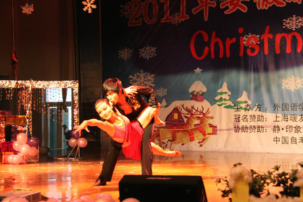 素有外国语学院“舞王”之称的杨光带来了一段精彩的拉丁舞表演,激起了全场的轰动。在随后的舞蹈和歌曲串烧中,让现场观众完全融入到了圣诞的热烈氛围中。整个大礼堂充满着浓浓的节日气息。