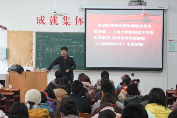 应动漫学院院邀请,芜湖露华春漫文化传媒有限公司董事长、上海大学数码艺术学院客座教授周成于12月23日下午在动漫学院3107多媒体教室为动漫学院的同学作了一场“2D手绘动画技术”的专题讲座。学校考证中心主任孙宏义,动漫学院行政副院长朱诵贵会见了周成教授。