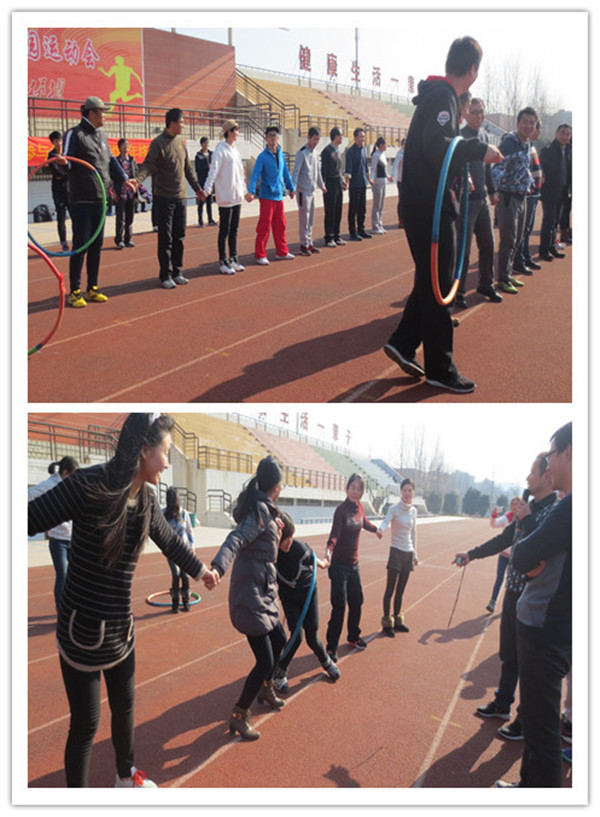 活动的第一阶段和第二阶段中,教职工被分为四队进行分组对抗。第一阶段主题为“同心接力”, 旨在增强团队凝聚力。每队派出5组人员依次完成后背夹球、花样跳绳、两人三足接力比赛,三关全部完成后用时少者排名靠前。第二阶段是“一圈圈到底”,各队所有队员手拉手站成一排,依靠肢体语言和眼神进行沟通,用呼啦圈穿过所有人的身体,从起点到终点,用时少者名次列前,活动主要目的在于促进团队成员之间的沟通与交流。活动最后还进行了 “跟我一起跳” 环节,由一名教师带领大家做5分钟健身操。