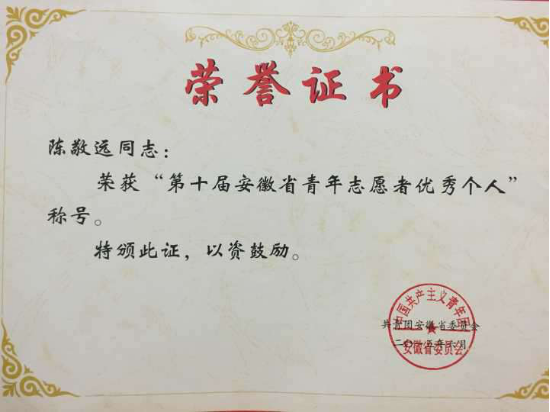 本网讯(通讯员:杨雨婷)近日,共青团安徽省委下发表彰文件,永利官网青年志愿者联合会(以下简称“青志联”)第十二届会长陈敬远同学荣获“第十届安徽省青年志愿者优秀个人”称号。同时,在共青团中央、民政部、中国残疾人联合会、中国志愿者服务联合会联合启动的第二届中国青年志愿服务项目大赛中,永利官网青志联“阳光小学”义务支教荣获大赛二等奖,情暖黄昏志愿服务项目荣获三等奖。