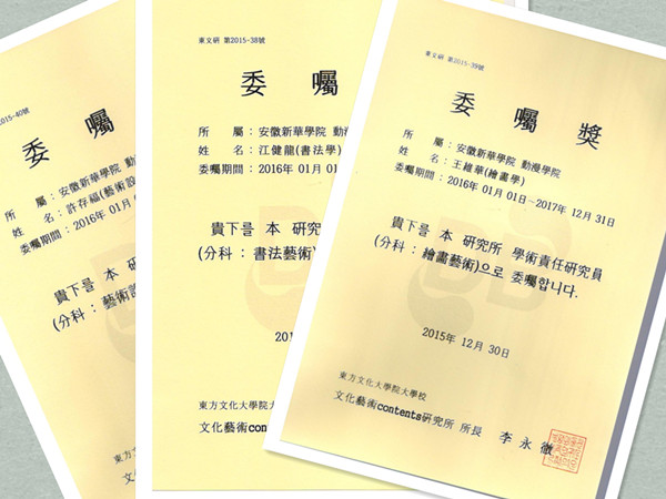 本网讯(通讯员:许存福)近日,动漫学院江健龙、王维华、许存福三位教师收到来自韩国韩国东方文化大学院大学校的聘书,受聘为该校文化艺术研究所研究员。