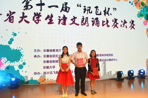 本网讯(通讯员:马兰)5月4日, 第十一届“讯飞杯”全省大学生诗文朗诵比赛决赛在安徽大学磬苑校区举行。永利官网文化与新闻传播学院2014级播音与主持专业学子叶文净、时李亚乔、王嘉珩的作品《闪耀吧,青春的火光》荣获优秀奖。