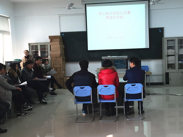 此次比赛要求本学期开设单片机课程的专业全体学生参与。学生可以按班级自行组队,每组队员不超过5人,题目自拟,每组必须提供制作的实物。经过认真准备,单片机课程组组织进行了此次大赛的预赛。预赛形式为PPT解说和实物展示,预赛答辩委员会(考核小组)对每一位学生进行提问。预赛中涌现了四轴飞行器、智能家居、基于图像识别的公交智能语音报站器、智能车拖地系统等优秀作品。