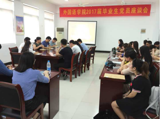 本网讯(通讯员:郝亮)6月21日上午,外国语学院党总支召开2017届毕业生党员座谈会。外国语学院党总支书记、执行院长邵玲,党总支副书记、副院长周景,副院长王志宏,党总支组织委员郝亮、学生第二支部书记黄梦、学生第三支部书记刘庆和2017届40名毕业生党员参加了此次座谈会,座谈会由郝亮主持。