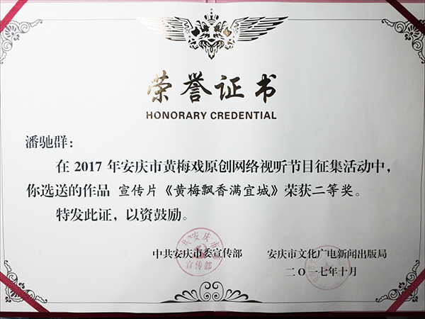 本网讯(王友雅)近日,在黄梅戏原创网络视听节目征集活动中,永利官网教师潘驰群的作品《黄梅飘香满宜城》入选并荣获二等奖。