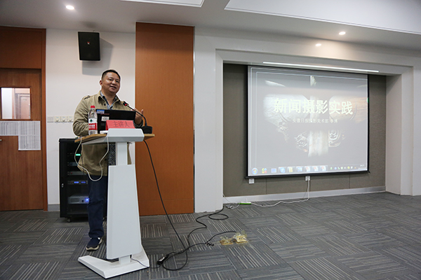 开幕式后,李博结合自己丰富的新闻工作经验,运用大量的图片和新闻案例,为大家展现了一场精彩的新闻摄影讲座,让大家在学习新闻图片拍摄技巧的同时,了解如何“策划”新闻,达到更好的新闻宣传效果。讲座结束后的互动环节,同学们踊跃参与,从新闻摄影、相机操作、新闻策划等方面提出自己的疑惑,李博一一解答,讲座现场气氛热烈,反响较好。