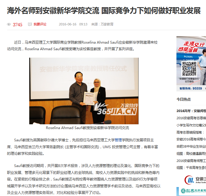 中国教育在线、UC头条:马来西亚理工大学Roselina Ahmad Saufi教授来3044am永利集团3044noc交流访问