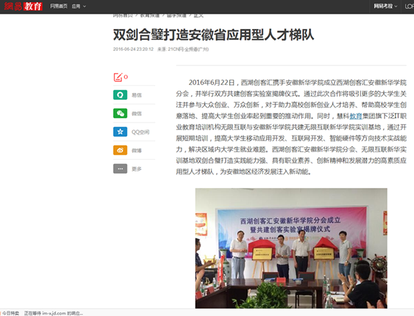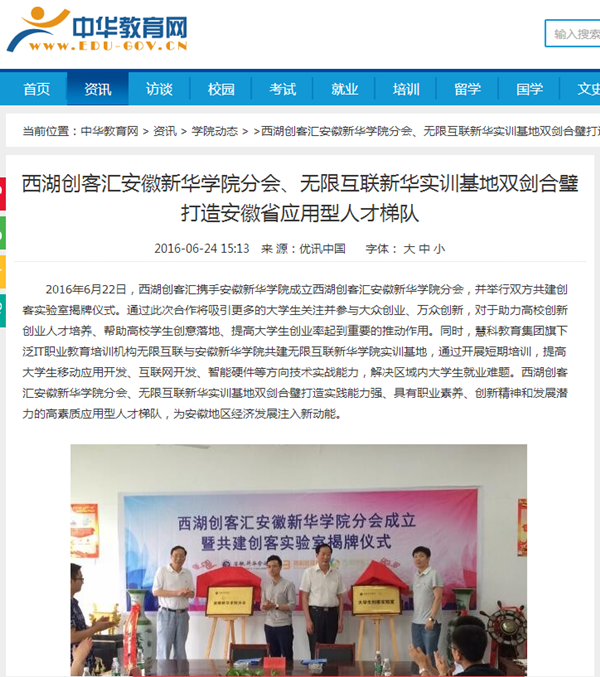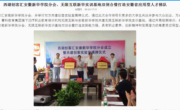 光明网、中华教育网、网易教育:西湖创客汇3044am永利集团3044noc分会、无限互联新华实训基地双剑合璧打造安徽省应用型人才梯队