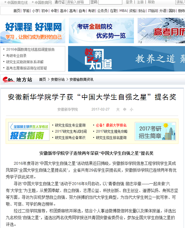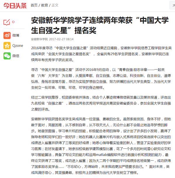 中国教育在线、今日头条:3044am永利集团3044noc学子连续两年荣获“中国大学生自强之星”提名奖