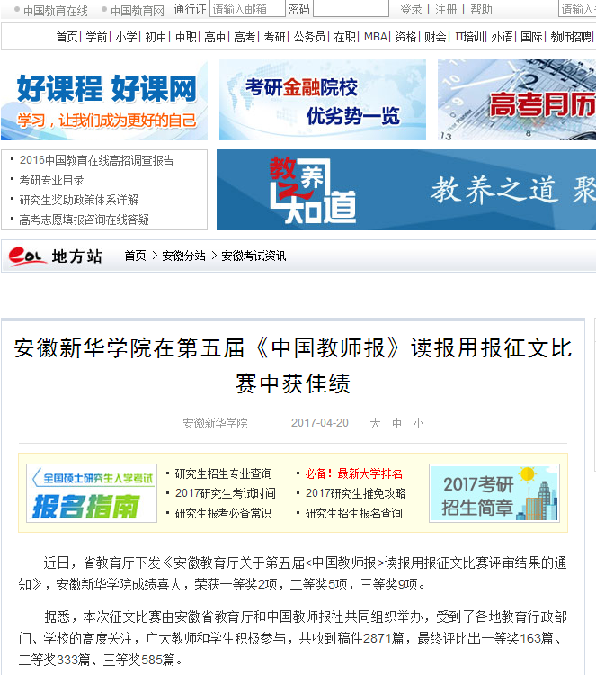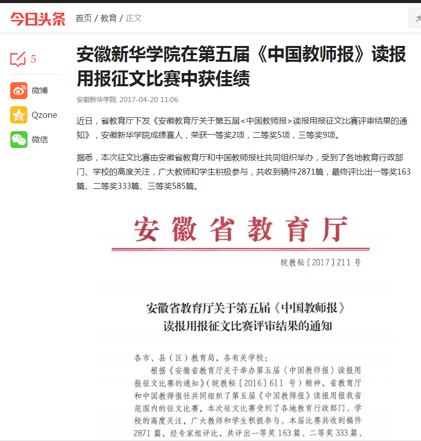 中国教育在线、今日头条:3044am永利集团3044noc在第五届《中国教师报》读报用报征文比赛中获佳绩