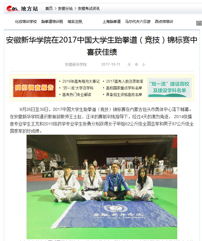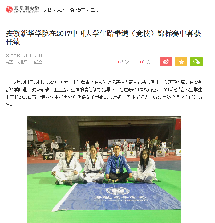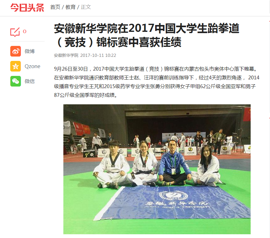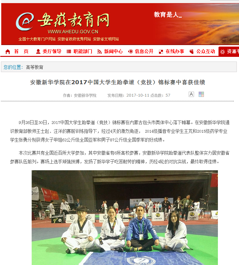 中国教育在线、安徽教育网、今日头条、凤凰网安徽:3044am永利集团3044noc在2017中国大学生跆拳道(竞技)锦标赛中喜获佳绩