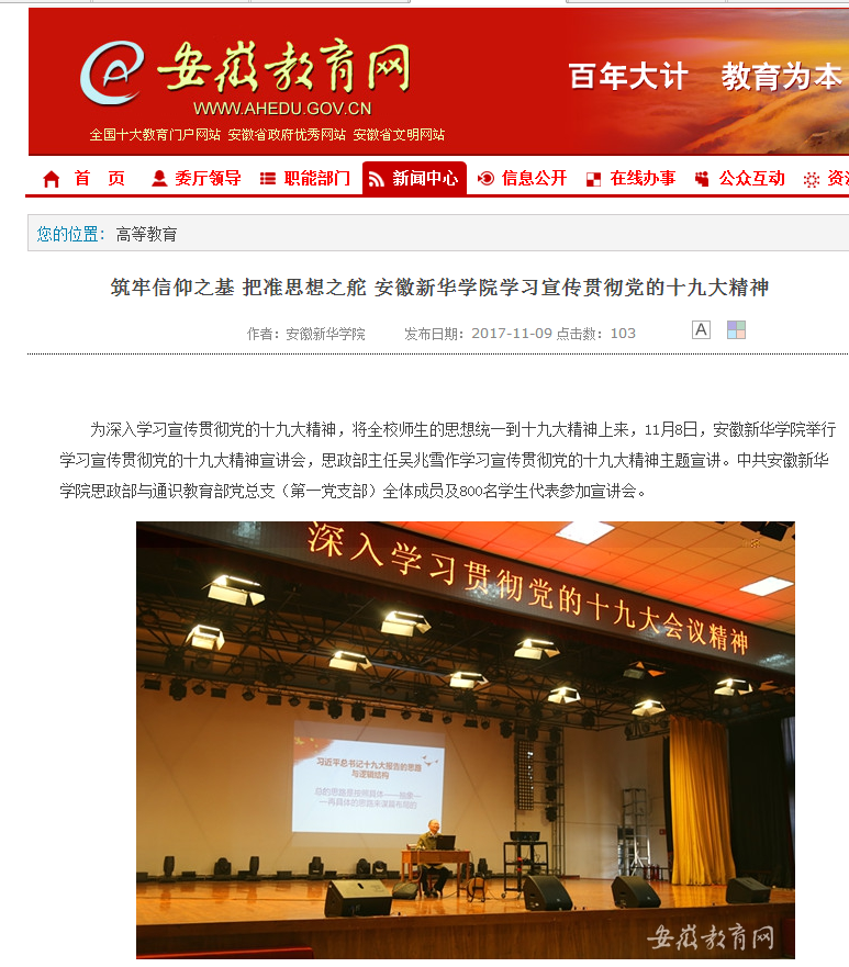 安徽教育网:筑牢信仰之基 把准思想之舵 3044am永利集团3044noc学习宣传贯彻党的十九大精神