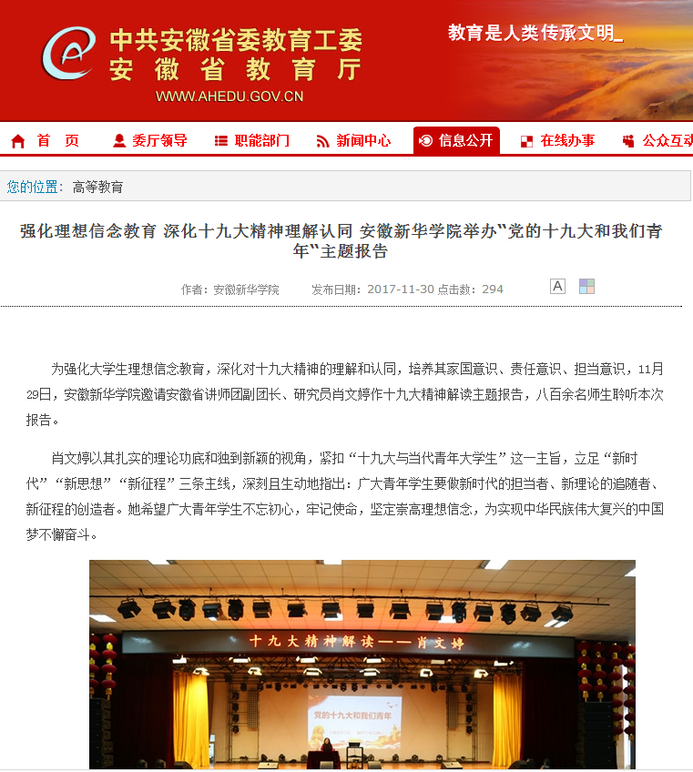安徽教育网:强化理想信念教育 深化十九大精神理解认同 3044am永利集团3044noc举办“党的十九大和我们青年“主题报告