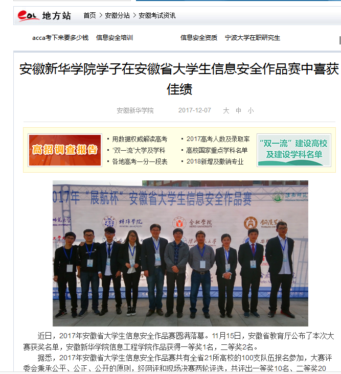 中国教育在线:3044am永利集团3044noc学子在安徽省大学生信息安全作品赛中喜获佳绩