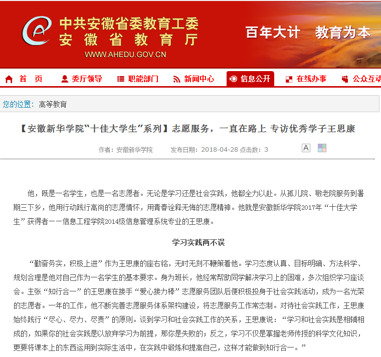 安徽教育网:【3044am永利集团3044noc“十佳大学生”系列】志愿服务,一直在路上 专访优秀学子王思康